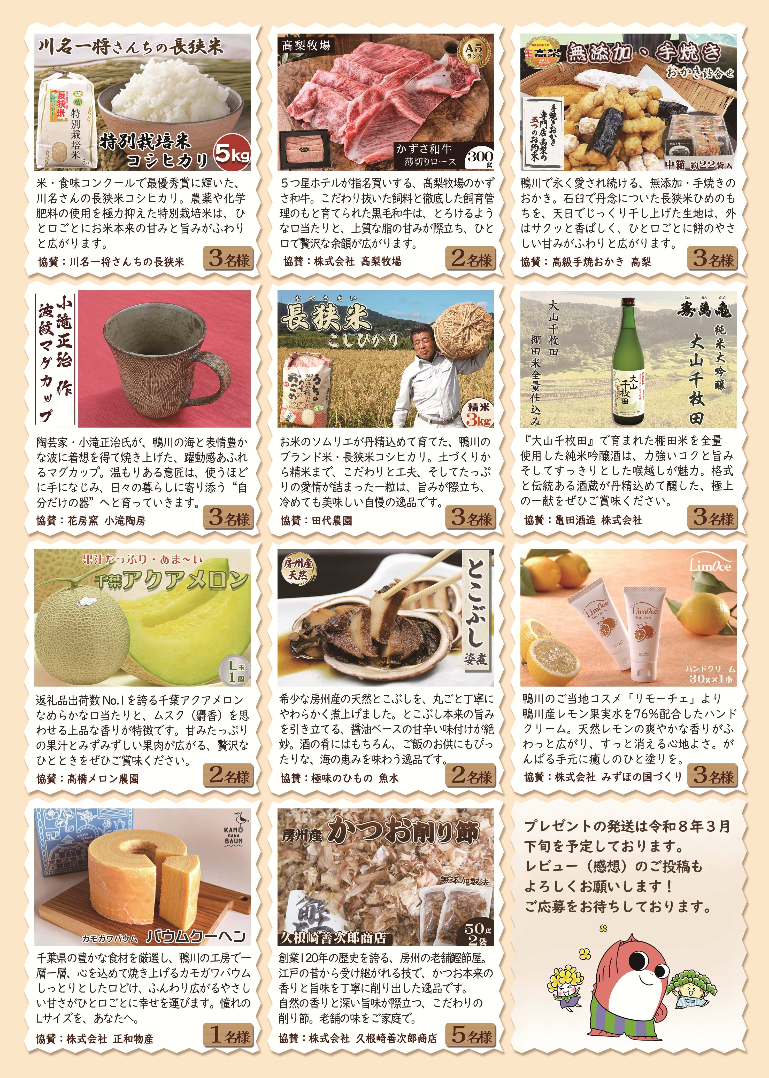 アンケートにご回答いただいた寄附者様の中から抽選で、鴨川市の特産物をプレゼントさせていただきます。